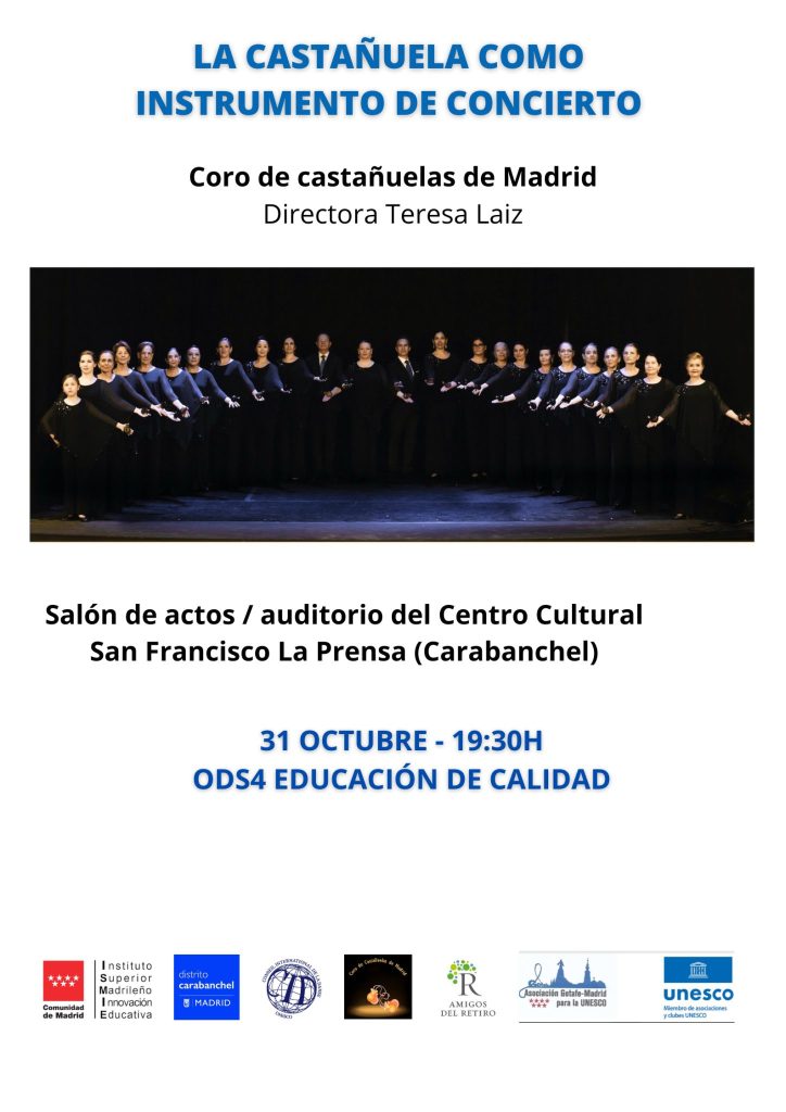 Un concierto poco habitual, donde las Castañuelas actúan principalmente como instrumento solista pero también como acompañamiento a la danza, interpretando música de diferentes estilos. En esta ocasión un programa atractivo y variado con música clásica, española y popular, con partituras para castañuelas compuestas por la concertista Teresa Laiz.
